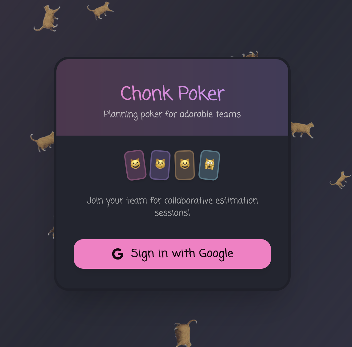 I built my new app chonk-poker. Its a planning poker game that uses the chonk scale. This is is how we size tickets at work now and its hilarious because every one keeps forgetting what size is what and the way we play planning poker is via a google meet chat, we count to three and post it at the same time. This stupid app is to make our planning session just a little bit smoother.
